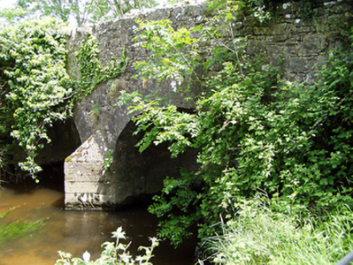 Three-arch road bridge over River Multeen built c. 1820. Coursed rubble limestone masonry walls, having dressed V-plan cutwaters to west elevation with pyramidal caps. Segmental arches flank central round arch, with cut limestone voussoirs.