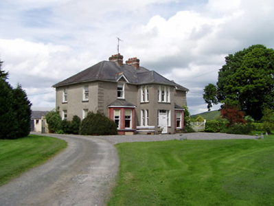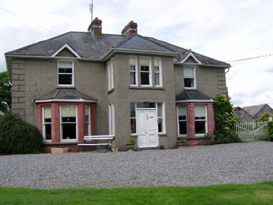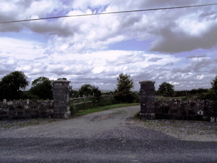 Detached three-bay two-storey house, built c. 1910, having projecting full-height central entrance bay, flanked by canted bay windows to end bays and having two-bay end elevations and flat-roofed two-bay single-storey extension to rear. Hipped slate roof with brick chimneystacks, with gablets to first floor front end windows, latter having terracotta ridge crestings and finials. Rendered lined-and-ruled rendered walls with render quoins, roughcast rendered walls to rear and red brick walling to bay windows. Square-headed window openings with one-over-one pane timber sliding sash windows, entrance bay having triple window to front over entrance and double to side. Limestone sills throughout, continuous to bay windows and to entrance bay. Square-headed door opening with overlight, sidelights and timber panelled double doors. Four-bay two-storey outbuilding to rear having pitched corrugated-iron roof and painted mass concrete walls, multiple-bay single-storey stables to north having pitched slate roof and rendered walls, and five-bay single-storey outbuilding to east having pitched corrugated-iron roof. Ashlar limestone piers to road entrance with carved limestone caps and plinths and sweeping roughly dressed limestone masonry walls with alternate vertically-set coping stones.
