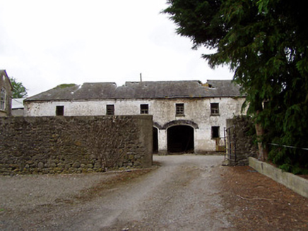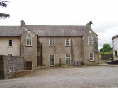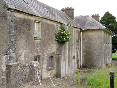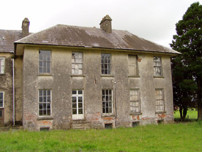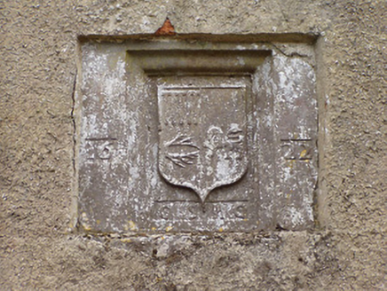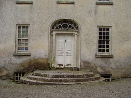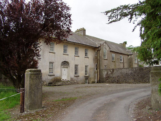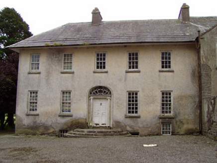 Detached multi-period country house, comprising five-bay two-storey over half-basement east block with four-bay end elevation, built c. 1730 onto four-bay two-storey house with attic and basement, with date plaque 1622 and initials GMDS, latter block having projecting gable-fronted end bays with pediment detailing, two-bay end elevation and projecting former chimneystack to rear. House now disused. Slate roof, pitched to west block with brick eaves course, and hipped to east, latter with overhanging sheeted eaves. Rendered chimneystacks. Roughcast rendered walls, brick to east block and coursed limestone masonry to west, latter having carved limestone date plaque with coat of arms. Square-headed timber sliding sash windows to east block, all with limestone sills, exposed sash boxes to front elevation, and six-over-six pane throughout except for nine-over-nine pane to ground floor front. Timber-sliding sash windows to west block, with exposed sash boxes and limestone sills throughout. Round-headed openings to first floor of projecting bays and square-headed elsewhere. First floor has six-over-six pane windows, round-headed windows having traceried fanlights below rendered roundels in gables above. Ground floor has openings with six-over-six pane windows to centre bays having six-pane overlights and end bays have nine-over-six pane windows. Narrow four-over-two pane and one-over-one pane windows to side elevation of east projecting bay. Mainly six-over-six pane windows to rear with some modern timber replacements. Entrance, to centre of east block, has elliptical-headed opening with moulded render surround and elaborate teardrop fanlight over timber panelled double door flanked by carved timber Ionic pilasters set on limestone plinths, having flight of curved ashlar limestone steps. Possible original doorway to west block in east projecting bay and having square-headed opening with replacement glazed timber door. Timber battened door with paned overlight to west gable. Five-bay two-storey former house, now outbuilding, to west, built c. 1675, having steeply-pitched corrugated-iron roof with openwork roughly dressed limestone bellcote possibly reuseing earlier stonework, and painted rendered rubble limestone walls. Square-headed openings with brick surrounds, replacement windows and limestone sills. Square-headed openings, mainly later intrusions, with timber battened doors, two entrances having limestone arches, one with carved limestone keystone. Bricked up window openings to rear elevation. Multiple-bay two-storey stables to south-west having hipped slate roof, with brick eaves course. Painted roughcast rendered walls. Square-headed openings some with remains of two-over-two pane and six-over-six pane timber sliding sash windows, all having limestone sills and segmental-arched carriage entrances with carved limestone voussoirs. Coursed rubble limestone and sandstone masonry wall forming two yards to front of houses, with rendered piers. Rendered square-profile piers to north-east approach.