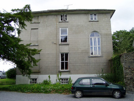 Detached five-bay three-storey over basement country house, built c. 1800, having central porch addition to front, with three-bay full-height return and three-bay three-storey addition to rear, latter supporting cast-iron water tank. Hipped slate roof to main block and return with overhanging sheeted eaves, moulded eaves course and rendered chimneystacks, with lean-to slate roof to addition. Rendered walls to front and west end elevations, lined-and-ruled render to east and roughcast render to rear. Square-headed openings, end windows of front façade being paired, with timber sliding sash windows to lower floors and having timber casement windows to second floor, all with limestone sills. Six-over-six pane windows to first floor and two-over-two pane to ground floor. East elevation has some blind openings to south end bay, barred windows to basement and round-headed first floor window to north end bay, latter being tripartite with slender round-profile mullions to fixed timber lights. Variety of timber sliding sash windows to rear elevation. Glazed timber porch with chamfered support posts, glazed roof and glazed timber double doors with paned overlight, accessed by flight of ashlar limestone steps over area. Round-headed door opening to interior, with spoked fanlight over timber panelled door and sidelights. Pair of three-bay former workers' houses to west, now outbuilding, having pitched slate roof, coursed rubble limestone and sandstone walls, square-headed openings with mainly three-over-three pane timber sliding sash windows with limestone sills and brick voussoirs, and square-headed openings with replacement timber doors. Yard to rear of house accessed by segmental-headed doorway and segmental-arched carriage entrance with roughly dressed limestone voussoirs, timber battened double doors and with pitched slate coping to latter entrance. Cobblestone surface in situ. Four-bay two-storey former outbuilding to east, now house, having single-storey single-bay addition to north, with pitched slate roof and brick chimneystack, coursed rubble sandstone and limestone walls, square-headed openings with recent two-over-two pane timber sliding sash windows with limestone sills and segmental-arched carriage entrance, with roughly dressed sandstone and limestone voussoirs having glazed timber door to centre. Road entrance has square-profile rendered piers with ball finial caps and sweeping rendered plinth with balustrades and rendered coping terminating in second pair of piers.