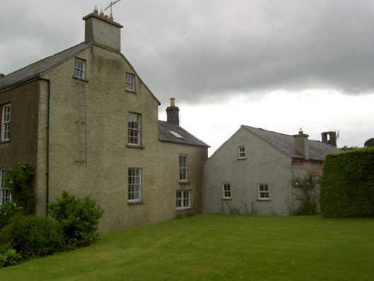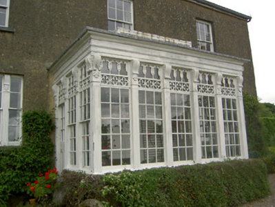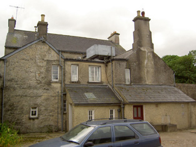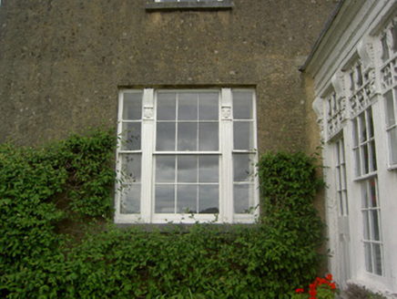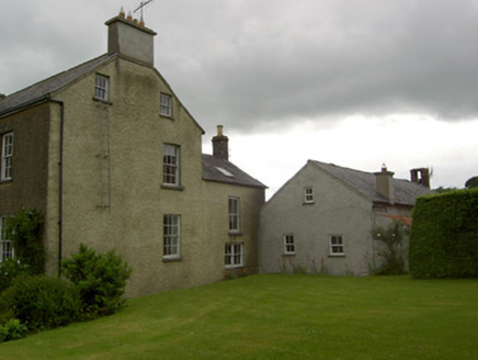 Detached three-bay two-storey over basement house with attic, built c. 1800, having later flat-roofed porch addition, with two two-storey gable ended returns to rear joined by two-storey flat-roofed section, and with further single-storey lean-to additions. Pitched slate roof with rendered end chimneystacks and uPVC rainwater goods. Rendered coping with raised box roof light to porch. Roughcast rendered walls with cut limestone cornice and having metal tie bar to upper front wall. Slate-hung section visible to rear. Square-headed window openings with timber sliding sash six-over-six pane windows, tripartite to ground floor and having lights separated by fluted pilasters surmounted by console brackets. Three-overthree pane windows to attic. Variety of six-over-six pane and two-over-two pane timber sliding sash and multi-pane timber casement windows to returns. Ornate timber porch comprising fluted pilasters surmounted by fluted console brackets separating fifteen pane windows, those of front being fixed and those of ends giving effect of six-over-nine pane timber sash windows, all surmounted by carved timber and glazed quatrefoil frieze and carved timber foliage, all in turn frieze with rope decoration. Square-headed door openings to porch with half-glazed timber panelled doors. Roughcast rendered and rubble limestone outbuildings with pitched slate roofs to rear. Rendered boundary walls and piers, having decorative cast-iron gates.