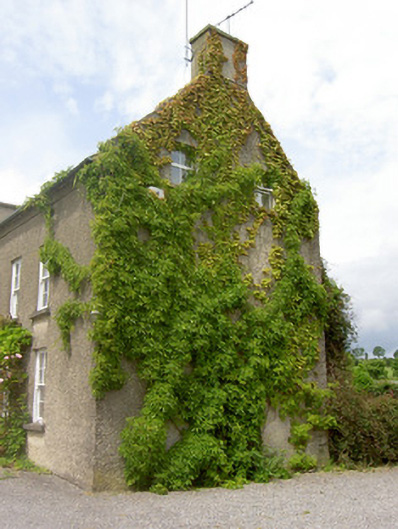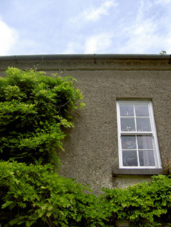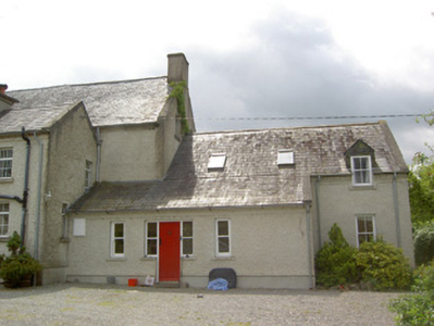 Detached five-bay two-storey with attic house, built c. 1700. Lower two-storey addition to rear with pitched slate roof and single-storey extension to east having dormer attic storey and lean-to extension under catslide roof to rear. Pitched slate roof with rendered end chimneystacks and cast-iron rainwater goods. Battered roughcast rendered walls with rendered notched brick eaves course. Notched brick eaves course to two-storey addition. Square-headed window openings with timber sliding sash four-over-four pane windows and tooled cut limestone sills. Replacement uPVC windows to attic and to two-storey addition. Square-headed door opening, modified since house was built, with glazed sidelights and timber panelled door. Single-storey outbuildings to rear with pitched corrugated-iron roofs and rendered walls.