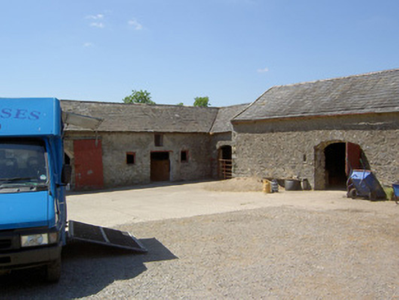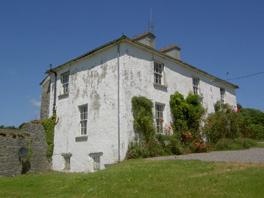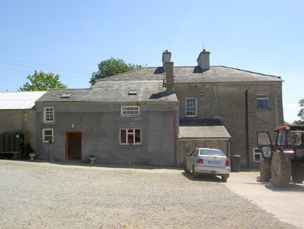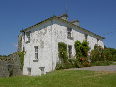 Detached three-bay two-storey house, built c. 1800, with basement to west end and single- and two-storey lean-to extensions to rear. Hipped slate roof with overhanging eaves, rendered eaves course, rendered chimneystacks and cast-iron rainwater goods. Painted roughcast rendered walls, unrendered rubble limestone to rear. Square-headed window openings with tooled cut limestone sills and replacement timber sliding sash six-over-six pane windows, having some replacement timber and uPVC to rear. Square-headed door opening with replacement timber panelled door, flanking timber sidelights and cobweb fanlight. Single-storey and lofted courtyard of outbuildings to rear, having pitched slate and corrugated-iron roofs, partially rendered rubble limestone walls, with bellcote to east gable of south range and segmental and square-arched carriage entrances. Roughcast rendered boundary walls and piers with cast-iron double-leaf gates.
