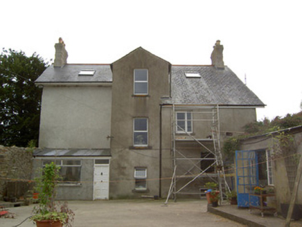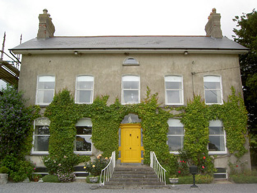 Detached five-bay two-storey over half-basement house, with attic and three-storey central return to rear, built c. 1750, possibly incorporating fabric of an earlier house. Extensions with artificial slate roofs to rear, single-storey lean-to north-west and higher extension to north-east, latter under catslide roof and pitched felt-roofed extension to south-west gable. Pitched artificial slate roof with overhanging eaves, rendered eaves course, decorative rendered red brick chimneystacks and uPVC rainwater goods. Smooth rendered walls. Diocletian window to attic storey having rendered reveals and cut limestone sills. Segmental-headed window openings with replacement aluminium windows and cut limestone sills. Round-headed door opening with glazed fanlight, overlights and timber panelled door, having sweep of cut limestone steps with cast-iron railings. Outbuildings in yard to rear, with pitched corrugated-iron roofs and rendered rubble limestone walls, one building being two-storey and having bellcote to gable.