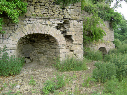 Double limekiln built into limestone outcrop at quarry, comprising two openings, larger situated on elevated site, built c. 1800, and smaller further recessed into outcrop, built c. 1820, both now disused. Random rubble and roughly coursed dressed limestone walls. Dressed limestone voussoirs to earlier elliptical-arched opening with rubble stone string course, with cut limestone voussoirs and setback to later adjacent round-headed opening.