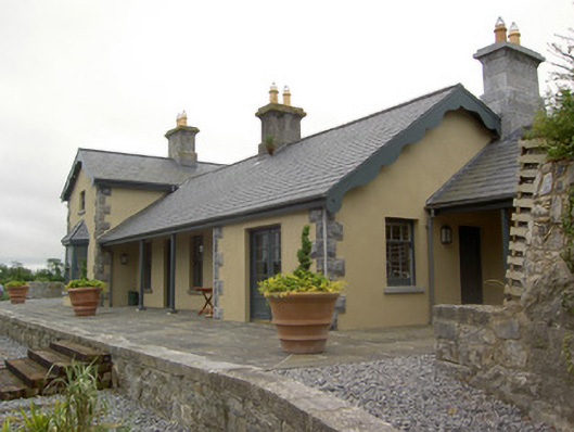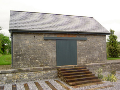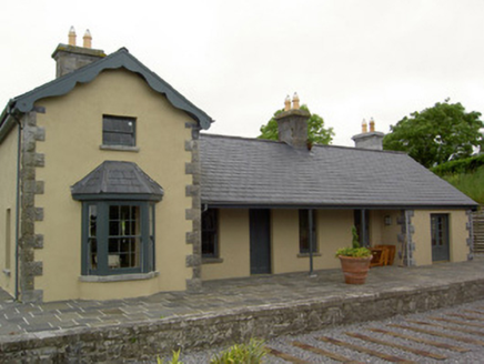 Detached six-bay former railway station, built c.1875, now in use as house. Comprises five-bay single-storey block having single-bay two-storey block at right angles to south with canted-bay window to front, lower block having catslide canopy supported on cast-iron columns and meeting front face of higher block. Single-storey additions to north and rear of lower block, latter under catslide roof. Pitched slate roofs with dressed limestone chimneystacks, carved timber bargeboards and cast-iron rainwater goods. Painted smooth rendered walls with rock-faced limestone quoins. Square-headed window openings with timber sliding sash windows, three-over-three pane to first floor, six-over-six pane elsewhere, all with cut limestone sills. Goods shed on opposite platform, having pitched slate roof and roughly coursed dressed limestone walls with cut limestone voussoirs. Oculus to south gable end with red brick surround and fixed timber framed window. Segmental-headed window to north gable end with block-and-start red brick surround, cut limestone sills and fixed timber-framed window. Square-headed door openings with red brick voussoirs and sliding timber battened doors. Roughly coursed dressed limestone platforms to site.