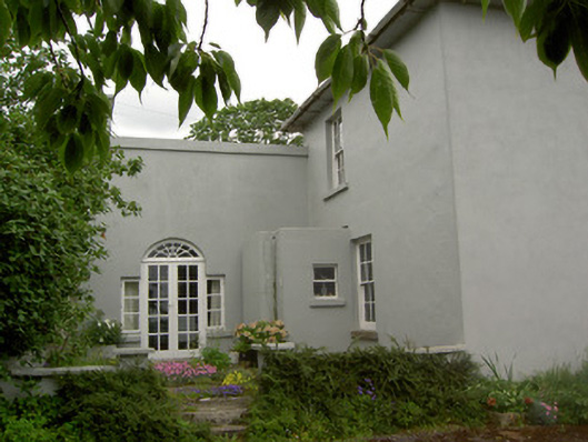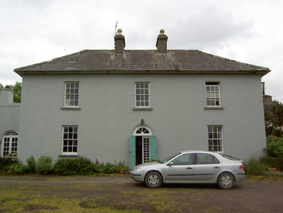 Detached three-bay two-storey house, built c. 1845, having two-storey flat-roofed addition to rear with lean-to extension and having recent two-storey single-storey extension to north and various single- and two-storey flat-roofed and lean-to extensions to rear. Hipped slate roof with overhanging sheeted eaves, ridge tiles, rendered chimneystacks with decorative clay pots and cast-iron rainwater goods. Painted smooth rendered walls. Square-headed window openings with tooled cut limestone sills and timber sliding sash six-over-six pane windows, with four-over-for pane window to addition. Round-headed door opening with moulded render archivolt, spoked timber fanlight and double leaf timber panelled doors. Random rubble limestone outbuildings to rear, having pitched slate and artificial slate roofs, with round-headed brick carriage arch. Painted smooth rendered boundary walls and piers, latter having cut limestone coping.