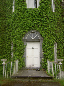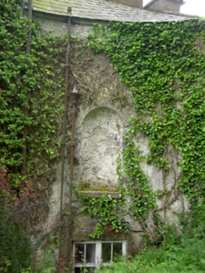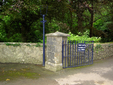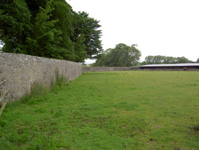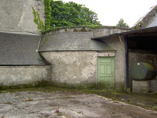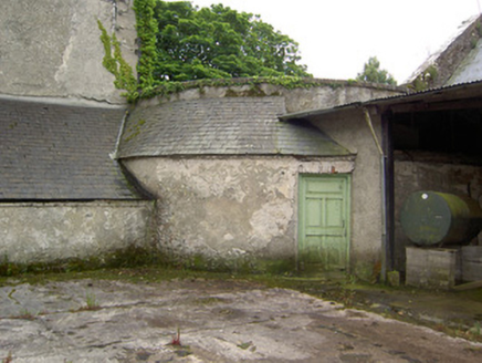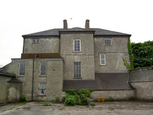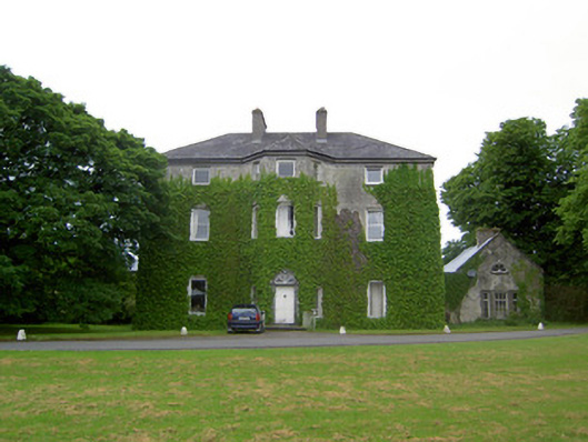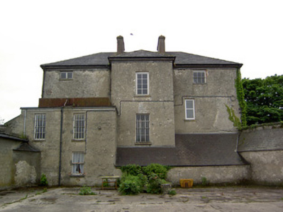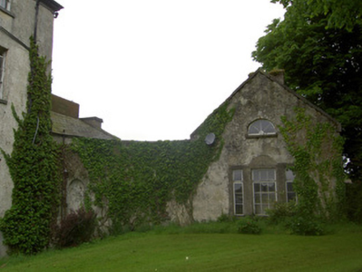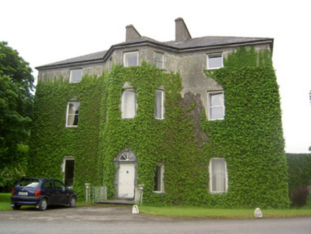 Detached three-bay three-storey over basement country house, built c. 1780, having two-bay side elevations, full-height canted central bay and flanking quadrant walls with terminating single-bay single-storey with attic gable-fronted pavillions. Rear elevation has single-bay three-storey central return and two-bay two-storey flat-roofed addition to north end. Hipped slate roof with carved limestone eaves course, rendered chimneystacks and cast-iron rainwater goods. Pitched slate roofs to pavillions. Cut limestone coping to flanking quadrant walls and pavillion gable-fronts. Roughcast render over brick and rubble limestone walls. Blind round-headed render niches having cut limestone sills to quadrant walls. Diminishing square-headed window openings to house with tooled cut limestone sills, having replacement timber casement and uPVC windows to front, timber sliding sash to north side wall, three-over-three pane to second floor and six-over-six pane to first floor. Barred one-over-one pane timber sliding sash windows to addition, one six-over-six pane to return and one three-over-three pane to second floor of rear elevation. All lower rear and basement windows are barred. Diocletian openings with tooled cut limestone sills and spoked fixed timber windows to attics of pavillions, tripartite windows with cut limestone sills and timber casement windows to ground floors. Round-headed door opening with cut limestone Gibbsian surround, carved limestone cornice and archivolt and having timber panelled door with spoked timber fanlight, approached by limestone steps with cast-iron railings. Outbuildings around yard to rear, incorporating pavillions. Walled garden to south-west. Bridge to entrance with rubble limestone walls and dressed limestone arches. Ashlar limestone gate piers with cast-iron lamp and gates.
