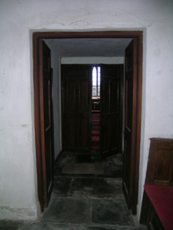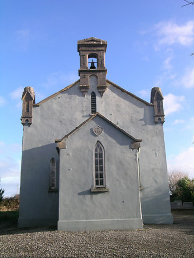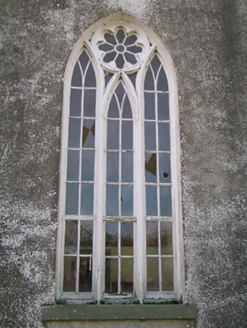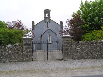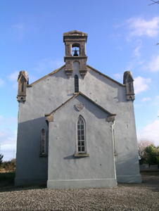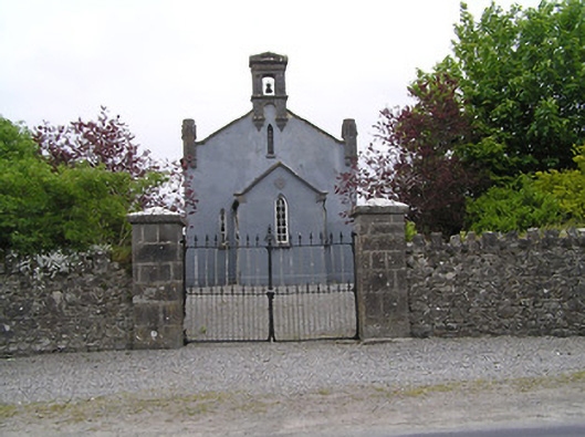 Detached gable-fronted Church of Ireland church, dated 1842, with three-bay nave, having entrance porch to gable-front. Closed 1997. Pitched slate roofs with carved limestone copings and cast-iron rainwater goods, downpipes discharging to cut limestone drains. Carved limestone bellcote to gable-front, with pediment and having chamfering and Tudor-arched openings to upper half, with bell, and supported on pyramidal corbels. Carved limestone finials to ends of gable-front with gables to panelled faces and supported on pyramidal corbels. Painted lined-and-ruled rendered walling to porch and gable-front, roughcast rubble limestone elsewhere, with rendered rubble limestone plinth and having carved limestone datestone to porch. Pointed arch openings with fixed timber windows, triple-light to east gable with spoked multifoil light above, sixteen-pane windows to nave and ten-pane windows to porch, all with Y-tracery and tooled limestone sills. Five-pane windows to gable-front and louvred vents to upper gables. Chamfered surrounds to interior of nave and main porch windows, and to doorway of vestible. Tudor-arch tooled limestone doorcase to entrance in north side of porch, with hood-moulding, limestone step and double-leaf timber battened door with thumb latch. Porch has bench opposite entrance door, and double-leaf timber panelled door to nave. Vestibule at west end of main space has vestry to inside north-west corner of main block and room to inside south-west corner, latter having stair to carved timber gallery over west end of nave. Stone flag floor to vestibule and to aisle of nave, timber boarded elsewhere. Timber panelling to altar backdrop, to pews of nave and gallery and to porch bench. Graveyard around church. Former church, later used as school, with pitched slate roof and rendered walls to north-west boundary of site. Rubble limestone boundary walls with dressed limestone piers and cast-iron gates.