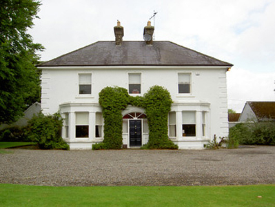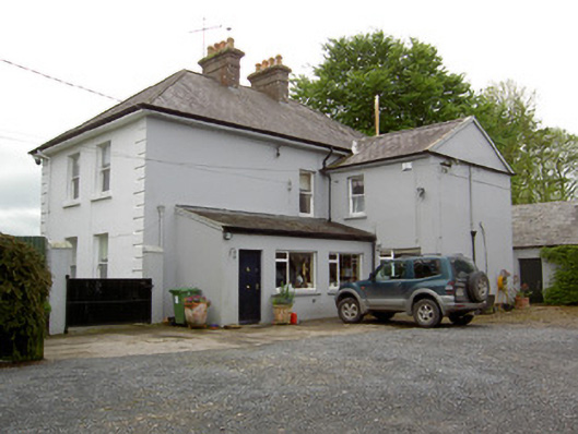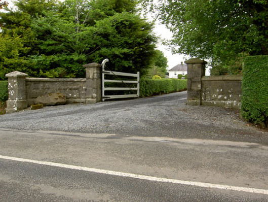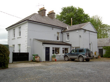 Detached three-bay two-storey house, built c. 1880 and rebuilt 1922, with two-bay end elevations, lower single-bay return and more single-storey lean-to slate addition to rear and having canted-bay windows to front elevation. Hipped slate roof with rendered chimneystacks, cast-iron rainwater goods and overhanging eaves and with pitched slate roof to return. Painted smooth rendered walls having render quoins to front and side elevations. Square-headed window openings with one-over-one pane timber sliding sash windows, decorative render surrounds and painted sills. Lights of bay windows separated by pilasters with moulded render capitals. Segmental-headed door opening with painted moulded render surround to timber panelled door spoked fanlight and sidelights, latter with timber panels below. Associated outbuildings have pitched artificial slate roofs and rendered walls. Cut limestone gate piers and rock-faced limestone walls to front of site with replacement timber gate.