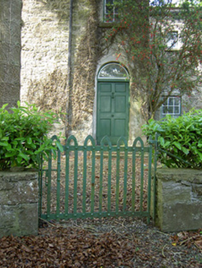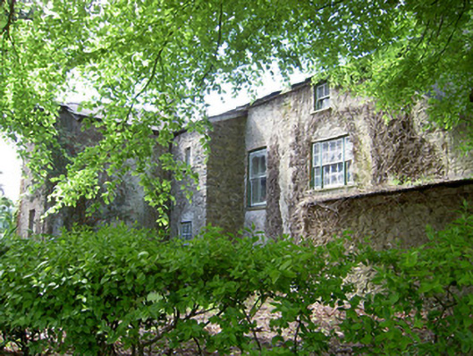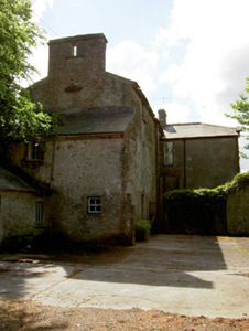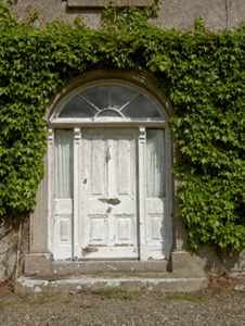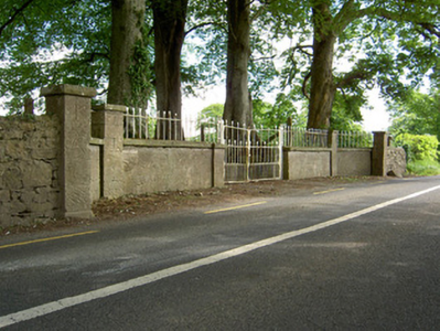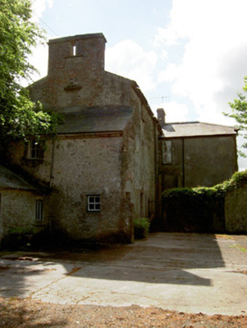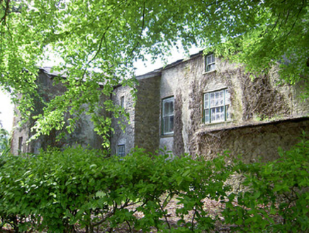 Detached house comprising three-bay two-storey front block, built c. 1840, having slightly-recessed ends to rear wall, possibly part of early eighteenth-century house, and slightly-higher three-bay three-storey earlier block to rear with two-storey lean-to addition to north gable, and with single-bay two-storey block at north-east re-entrant angle. Canted-bay windows to front elevation. Hipped slate roof with terracotta ridge cresting, rendered chimneystacks and cut limestone corbel table to front block and pitched slate roof and red brick chimneystacks to rear block. Roughcast rendered walls to front block, having mainly exposed rubble limestone to rear block and north-east gable of front block. Square-headed window openings with tooled limestone sills, having decorative render surrounds to front. Some replacement uPVC windows to front and timber sliding sash elsewhere, one-over-one pane to front block, with one narrow four-over-pane to rear and one-over-one, two-over-two and single and tripartite six-over-six pane windows to rear block, all windows having tooled limestone sills. Segmental-headed front door opening with carved limestone surround and archivolt with timber panelled door flanked by side-lights with timber panelling below and panelled timber pilasters with spoked fanlight above and limestone steps to door. Round-headed timber panelled door to north-east elevation of two-storey re-entrant block. Single-storey with loft outbuildings to rear yard with pitched slate roofs, rendered walls and segmental-headed carriage entrances. Freestanding cast-iron pump to yard. Cast-iron entrance gates and railings to road boundary set to dressed limestone piers and flanking walls terminating in pairs of piers.