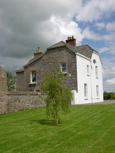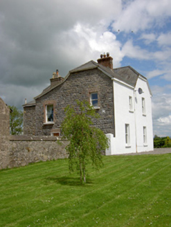 Detached three-bay two-storey house, built c.1890, with lower L-plan two-storey return to rear and possibly recent canted-bay windows to front elevation. Half-hipped artificial slate roof with rendered eaves course and rendered and having rendered and red brick chimneystacks to return part of house. Exposed rubble limestone walls to front elevation revealing segmental brick relieving arches to bay windows and painted smooth rendered elsewhere. Square-headed window openings with one-over-one pane timber sliding sash windows with painted sills and red brick block-and-start surrounds. Round-headed window to centre of first floor of front elevation. Segmental brick-arched door opening having timber panelled door with stained glass side-lights and fanlight. Outbuilding to rear of site with pitched slate roof, roughcast rendered walls and flat-headed carriage entrances. Cast-iron gates set to rubble limestone piers and rendered sweep walls to front of site.