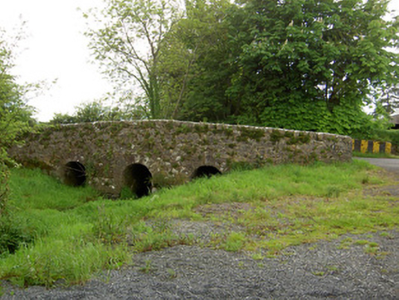 Three-arch hump back road bridge over river, built c.1800. Rubble limestone walls with dressed voussoirs to round arches. Square plinth to base of arches.
