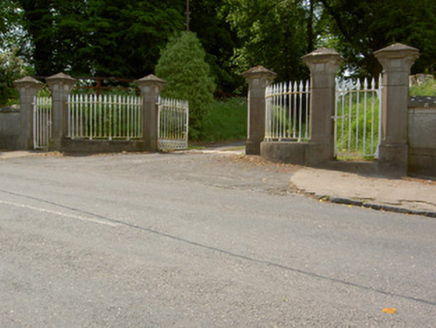 Detached two-pile two-storey house, built c. 1900, three-bays to first floor front, five-bay to ground floor front and having rear pile c.1820 projecting one further bay to south, the whole remodelled c.1890. Gabled breakfront and lean-to porch to front, canted-bay window and conservatory to south-east. Attached single-storey with attic former outbuilding to rear now incorporated into house. Pitched slate roofs, hipped to south-east end of rear pile, with terracotta ridge tiles, rendered chimneystacks, cast-iron rainwater goods and having red brick eaves course to rear pile and tiled roof to canted-bay window. Dry dashed walls to front elevation, smooth rendered to all other elevations, with render quoins to first floor of porch and red brick quoins to rear pile. Square-headed window openings throughout, having timber sliding sash windows to front elevation and to former outbuilding, six-over-one pane to first floor front and to canted-bay, double to end bays and one-over-one pane to ground floor front and to former outbuilding, all windows having concrete sills. Replacement uPVC windows to rear elevation, with red brick block-and-start surrounds. Square-headed door opening with replacement timber panelled door, flanked by square-headed side-lights with leaded glazing bars, having render canopy above and moulded render cornice over with recent lean-to slate roof. L-plan two-storey outbuilding to rear with pitched and hipped corrugated-iron roof and roughcast rendered walls. Decorative cast-iron gates to road entrance, with vehicular and pedestrian gateways set to chamfered square-plan piers with pyramidal caps and flanked by rendered sweep walls.
