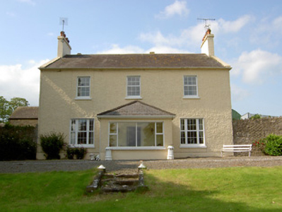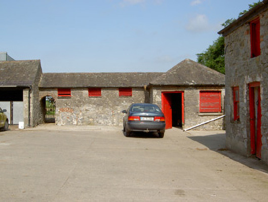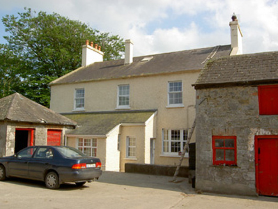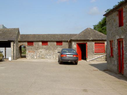 Detached three-bay two-storey house, built c.1860, with recent hipped porch to front and single-storey lean-to extension to rear. Pitched slate roof with rendered chimneystacks and cast-iron rainwater goods. Painted pebbledashed walls. Square-headed window openings with replacement uPVC windows and painted sills. Square-headed door opening to porch with replacement uPVC door. Rubble limestone walls flanking house with pointed arch pedestrian gateways with yellow brick voussoirs to arches. Wrought-iron gate to western integral archway and replacement timber battened door to eastern. Outbuildings arranged around courtyard to rear of house. Three-bay two-storey north range with hipped slate roof and timber battened fittings, single-storey carthouse to west with blocked segmental brick-arched carriage entrance and having recently reslated hipped roof and L-plan multiple-bay single-storey east range with pitched and hipped slate roofs with louvered timber windows and battened timber door. Round-arched pedestrian gateway to north range of outbuildings with red brick voussoirs to arch and wrought-iron gate. Replacement wrought-iron gate set to roughly-dressed limestone gate piers and rubble limestone walls to front of site.