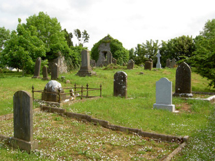 Detached Church of Ireland church, built 1859-60, comprising four-bay nave, single-bay chancel, vestry to north-east and three-stage corner tower with spire to south elevation. Now in state of ruin. Pitched roof with timber scissors brace roof structure exposed to elements, cast-iron rainwater goods and limestone copings and corbel tables. Dressed roughly-coursed sandstone walls with cut limestone quoins and plinth. North-east gable broken through. Snecked dressed sandstone walls to tower, having buttresses to lowest stage, cut limestone quoins, plinth and string course between upper stages. Pointed arch window openings to nave, two-light and with oculus above to south-west gable and with remains of three-light window to chancel, all with chamfered limestone surrounds. Double-light window to vestry with remains of wrought-iron leaded glazing. Tower has cinquefoil window set into round panel over entrance doorway, triple louvered pointed arch windows to top stage having moulded impost course and trefoils and pointed arches recessed. Pointed arch entrance door to tower with tooled limestone surround, shouldered door opening with limestone surround to vestry. Carved limestone bracketed cornice having tapering ashlar limestone blocks to spire with pointed headed vents and cast-iron cross finial. Rubble limestone walls of ruinous medieval church and limestone memorial to site with recumbent and upstanding grave markers to graveyard. Wrought-iron gates to front of site.