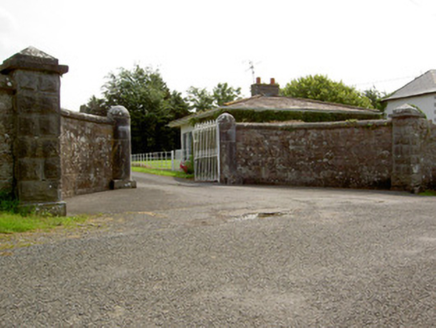 Detached square-plan three-bay single-storey former gate lodge, built c.1850, with two-bay end walls, lean-to extension to rear and recessed porch to front. Now in use as private house. Pyramidal slate roof with rendered chimneystack, clay ridge tiles and overhanging eaves. Painted smooth rendered walls. Square-headed window openings with six-over-six pane timber sliding sash windows with painted sills and battened and shutters, louvered to front and battened to north-east end elevation. Blind window to north-east end elevation. Square-headed porch opening with curved inner wall containing curved double-leaf timber battened door to one side. Wrought-iron double-leaf gate and fence to front of site. Paired decorative cast-iron gates set to round-profile tooled limestone piers with domed caps and square plinths to south-west of lodge, flanked by snecked dressed sandstone quadrant walls terminating in square-profile piers with margined rock-faced shafts and plinths and cut pyramidal limestone caps.