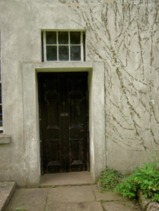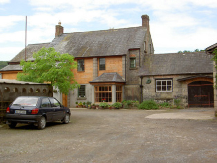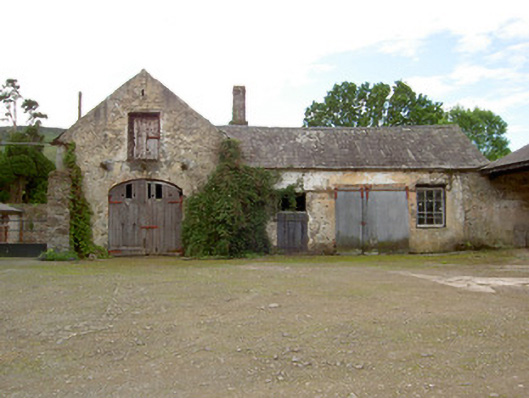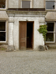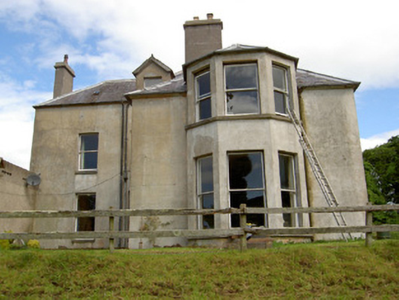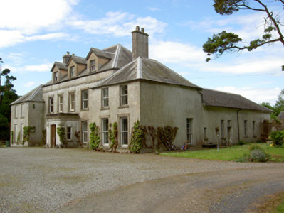 Detached five-bay two-storey country house, built c.1840, with dormer attic, porch to front, two-bay two-storey projecting flanking wings, that to south having canted-bay window to side wall. Single-bay two-storey return to south wing and multiple-bay single-storey addition to rear of north wing. Hipped slate roofs with lead flashing, rendered chimneystacks and cast-iron rainwater goods. Ruled-and-lined rendered walls with render string course below eaves of main block. Square-headed window openings throughout with tooled limestone sills, having one-over-one pane timber sliding sash windows to all elevations except north and one rear window, having moulded render surrounds to front lower storeys of main block and to front ground floor of north wing. Blind or blocked windows to front of south wing, nine-over-six pane window to north elevation of north wing and six-over-six pane windows to north addition and to sash window in rear of main block. One-over-one pane timber sliding sash dormer windows to front and rear elevations of main block with pitched slate roofs. Flat-roofed porch with render pilasters to front corners and having heavy moulded render cornice, with square-headed door opening with double-leaf timber panelled door. Square-headed timber panelled door to north addition with six-pane overlight. Four-centred pedestrian arch to rear yard with decoratively-carved terracotta surround. Dressed limestone gate piers to north with wrought-iron gates. Part-lofted single-storey outbuildings to yard with pitched slate roofs, rubble limestone walls and square-headed door and window openings and segmental-arched carriage entrance with timber battened doors and having bellcote to rear with bell. Freestanding pump to yard. Modernised two-storey with attic house located to north-west, having pitch slate roof, red brick chimneystacks, rubble limestone walls with render quoins. Some timber sliding sash windows, with mainly replacement windows and door.