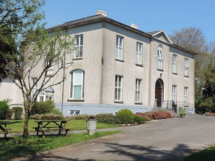 Detached five-bay two-storey over half-basement country house, built c.1800, having slight breakfront to entrance bay, with interior chapel and having two-bay two-storey addition to west and range of outbuildings and walled garden to rear. Hipped slate roof and rendered walls with square-headed timber sliding sash windows, one-over-one pane except for three-over-six pane to basement. Round-headed replacement timber panelled double-leaf door, and fanlight.