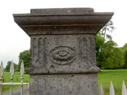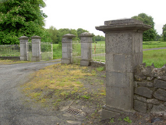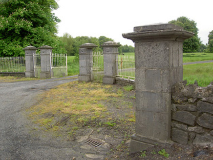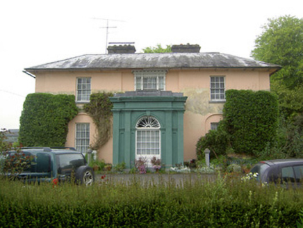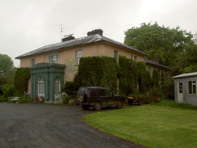 Detached three-bay two-storey house, built c. 1820, with slightly advanced end bays flanking entrance porch, two-bay side elevations, lower three-bay two-storey wing to rear and recent glazed porch to west. Hipped slate roof with overhanging sheeted eaves, rendered chimneystacks and cast-iron rainwater goods held in place by decorative wrought-iron brackets. Rendered coping to entrance porch. Hipped slate roof with rendered chimneystacks to wing. Painted smooth rendered walls. Square-headed window openings with timber sliding sash six-over-six pane windows to ground and first floor, those to ground floor set in elliptical-arched recesses. First floor of central bay has highly ornate square-headed surround to tripartite window opening, comprising panelled pilasters surmounted by console brackets and moulded panelled entablature with scalloped detailing to underside of eaves and to window heads. Porch comprises paired render pilasters to front corners with moulded capitals, entablature and impost course. Round-headed window to front wall and door openings to sides, with ornate cobweb fanlights over openings, having fixed twenty-pane window and twelve-pane half-glazed doors. Cut limestone steps and round-profile moulded capped piers with cast-iron railings flanking each side of porch. Multiple-bay two-storey outbuildings to north-west of site having pitched slate roof and roughcast rendered walls with square-headed openings, some with timber louvre fittings. Elliptical-arched gateway surmounted by cut-stone bellcote to yard. Quadrant entrance gates at road comprise vehicular entrance flanked by pedestrian entrances. Ashlar limestone piers with moulded caps and plinths to inner pairs of piers and outer terminating piers, with inner pairs of piers having string course, fluting and floral motifs to centre piers. Wrought-iron spearhead railings and double-leaf and single-leaf gates.