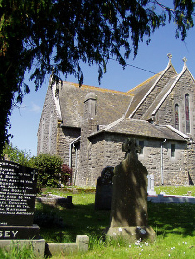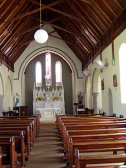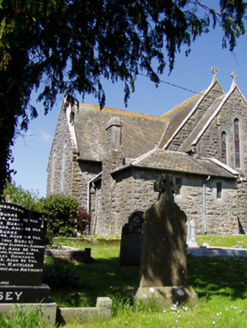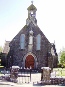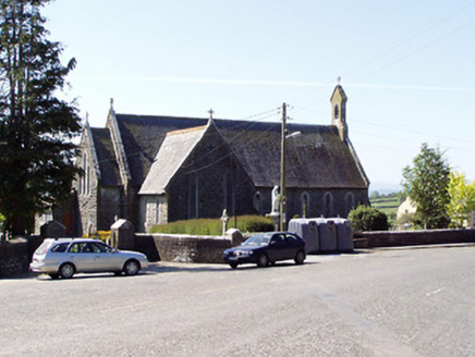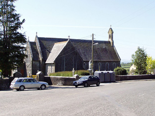 Detached cruciform-plan gable-fronted Gothic Revival Roman Catholic church, built 1883, with five-bay nave elevations, two-bay transepts, sacristy to south-east and having porches to east end of main elevations. Pitched slate roofs with decorative ridge cresting, cut limestone bellcote to gable-front and having cast-iron crosses to all gables. Hipped roof with cut limestone chimneystack to sacristy. Snecked rock-faced limestone walls with chamfered cut limestone block-and-start surrounds to opening and having buttresses to corners of gable-front. Station in canopied projection over entrance in gable-front and supported on sculpted corbel. Pointed arch window openings having cast-iron lattice glazing. Main entrance has pointed chamfered carved limestone surround with hood-moulding and double-leaf timber battened door with ornate strap hinges. Quatrefoil aperture with hood moulding to apex of gable-front. Timber diagonally-battened double-leaf door to west porch, set into shouldered opening with roundel to tympanum, all set into pointed opening, with steps. Interior comprising timber scissor brace roof structure, two arch pointed arcade to transepts having carved round limestone columns, sculpted marble reredos to apse and stained glass windows to transepts. Small carved timber gallery over porch to entrance end. Square-profile limestone piers to front of church with cut-stone cap and decorative double-leaf cast-iron gates and roughly-dressed limestone plinths having cast-iron railings. Square-profile limestone piers with gabled caps to graveyard, having double-leaf spear-headed cast-iron gates with snecked limestone walls terminated by a second pair of limestone piers.