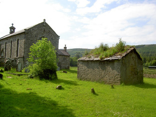 Freestanding mausoleum, erected c. 1825, comprising pitched slate roof and rendered random rubble sandstone walls. Pointed arch limestone plaques to front façade, one having engraved lettering. Loop light to rear façade. Pointed arch door opening with cut sandstone surround, now bricked up, having cut sandstone steps descending to entrance.