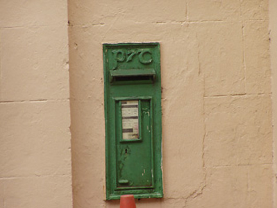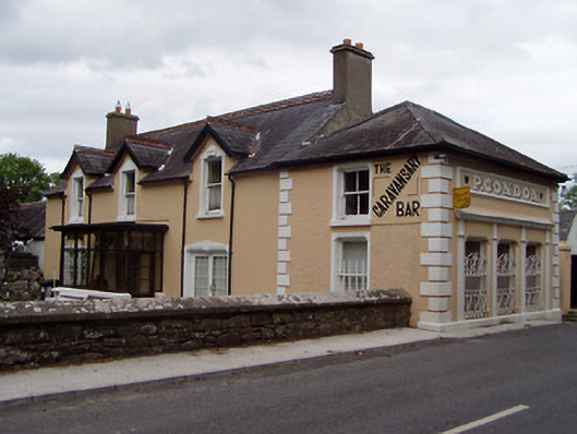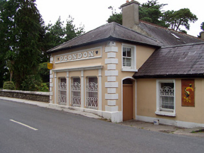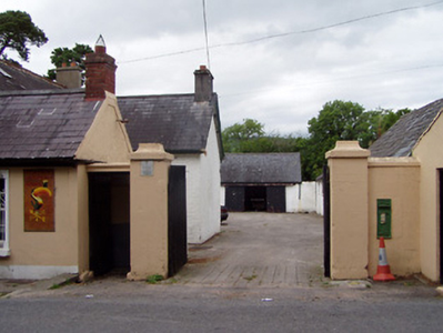 Detached three-bay two-storey former house, built c. 1860, with dormer windows and recent flat-roofed porch to front, single-bay single-storey return with pitched slate roof to rear, and lower three-bay block to south at right angles to main block and parallel to road having two-bay single-storey addition to east. Now in use as a public house. Pitched slate roof to main block with terracotta ridge crestings to roof and to dormers, with rendered chimneystacks. Hipped slate roof to south block with red brick chimneystack. Painted rendered walls, with render quoins to south block. Square-headed openings to main block with rendered surrounds, having one-over-one pane timber sliding sash windows to first floor, double to rear, and replacement timber glazed doors to ground floor. Chamfered render surrounds to south block windows, with two-over-two pane timber sliding sash windows to first floor and barred one-over-one pane to ground floor. Render shopfront to south block with render cornice, render fascia with painted lettering, and pilasters with fluted capitals flanking triple display window with chamfered surrounds and decorative cast-iron railings. Segmental-headed entrance to east side wall of south block with timber battened door. Pair of square-profile piers with caps leading to yard having multiple-bay single-storey outbuildings to north and east with pitched slate roofs and painted roughcast rendered walls. Cast-iron wall-mounted post box, c.1930, with P&T emblem to east side of entrance to yard.