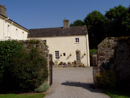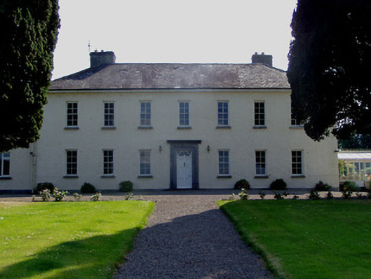 Detached seven-bay two-storey country house, built c. 1780, incorporating possible seventeenth-century structure within slightly lower three-bay two-storey rear block to south-east. Single-bay two-storey flat-roofed extension to east end of façade links two blocks. Two-bay single-storey lean-to addition with slate roof to rear of main block, with conservatory to west gable. Hipped slate roof to main block, pitched to earlier block, with rendered chimneystacks, that to earlier block being stout. Painted roughcast rendered walls, with limestone plinth course to front elevation of main block. Narrow square-headed window openings with four-over-four pane timber sliding sash windows and limestone sills. Square-headed openings with replacement timber windows to extensions. Two-over-two pane timber sliding sash and casement windows to rear elevation of earlier block. Entrance comprises carved limestone doorcase having raised moulded surround to opening, moulded cornice and timber panelled door with cobweb fanlight detail to overlight. Lawns to front of house. Two-bay single-storey outbuilding to west having pitched corrugated-iron roof with painted render over coursed rubble sandstone masonry walls, with lean-to extensions. Yard bounded by coursed rubble sandstone masonry walls with double-leaf cast-iron gates.