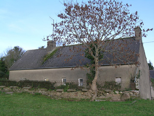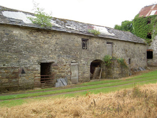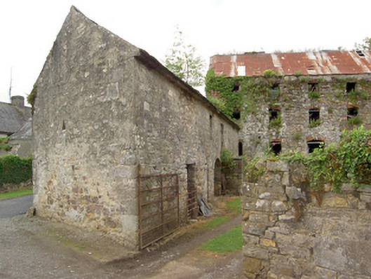 Detached five-bay three-storey watermill with attic, built c. 1830, now disused. Pitched corrugated-iron roof with cast-iron rainwater goods. Roughly coursed rubble sandstone walls with dressed sandstone quoins. Segmental-headed window and door openings with red brick voussoirs. Multiple-bay outbuildings to yard to front of watermill, to south-west and south-east, two-storey and single-storey respectively, having pitched slate roofs with ridge tiles and roughly coursed rubble sandstone walls. Square-headed door and window openings with timber and stone lintels, and with three-centred arch carriage entrances to front walls of each building with cut sandstone voussoirs. Pitching door to first floor of west building accessed by stone steps to front elevation. Ashlar sandstone piers with cast-iron gates to east side of yard. Millrace to east of site and former miller's house to west. House is five-bay, two-storey to front and single-storey to rear, with pitched corrugated-asbestos, formerly thatched roof, with rendered chimneystack, roughcast rendered walls with square-headed one-over-one pane timber sliding sash windows and replacement uPVC door, with yard to front having outbuilding to south-east corner.