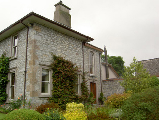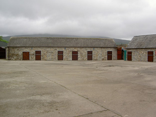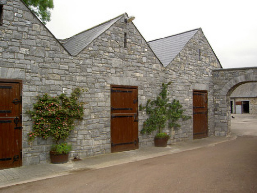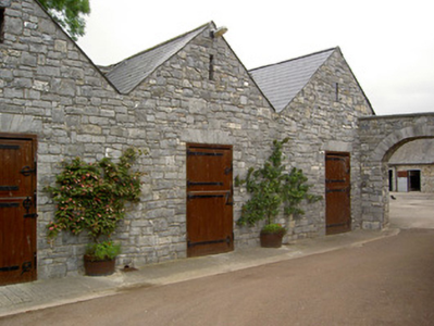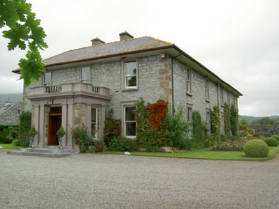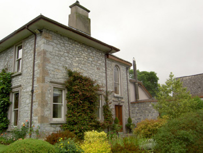 Detached L-plan three-bay two-storey house, built c. 1870, having five-bay south side elevation and projecting front entrance porch. Slightly lower addition to rear of house lean-to roof and recent monopitch, pitched and hipped roof single- and two-storey extensions further to rear. Overhanging hipped slate roof with clay ridge tiles, rendered chimneystacks and cast-iron rainwater goods. Rendered parapet to flat roof of porch with moulded coping, cast-iron railing to front and rendered moulded cornice. Roughly coursed snecked limestone walls to house, formerly rendered, with dressed sandstone quoins. Square-headed window openings having timber sliding sash one-over-one pane windows with moulded render surrounds, having moulded cornices to ground floor, with cut limestone sills. Round-headed window to addition with margined one-over-one pane timber sliding sash window with moulded render surround. Porch has render pilasters with moulded capitals and plinths flanking entrance door and windows to side walls, paired to former. Square-headed door opening to porch with double-leaf timber panelled door and decorative overlight, with limestone steps. Square-headed glazed timber door to addition with moulded render surround and carriage lantern. Yard of single-storey outbuildings to north of house, comprising four-pile building with sawtooth profile to slate roofs west having exposed snecked rubble limestone walls with linked elliptical-headed limestone carriage entrance arch having dressed limestone voussoirs and keystone. Ranges of single-pile outbuildings with similar detailing to north and east, having eaves course and square-headed doorways, some blocked and some recent insertions. Landscaped garden to south-east.