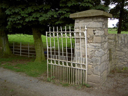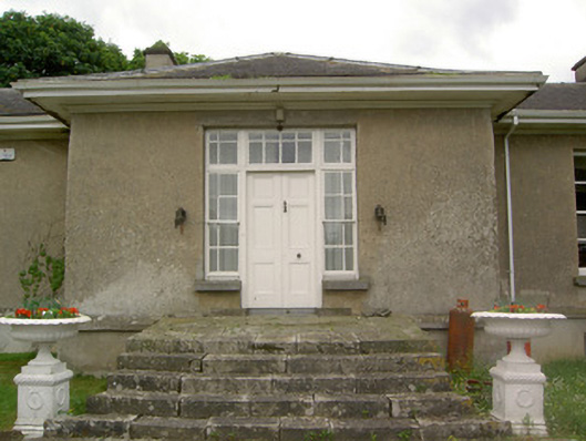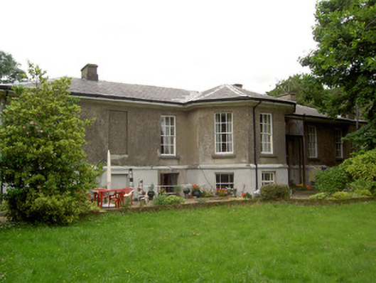Detached five-bay single-storey house over half-basement, built c. 1830, with projecting middle bay and having half-hexagonal bow projection to rear. Sprocketed hipped slate roof with lead ridge capping, overhanging eaves, rendered chimneystacks and replacement uPVC rainwater goods. Smooth rendered walls with render stringcourse between floors, with some ruled-and-lined render to half-basement storey. Square-headed window openings with timber sliding sash windows, six-over-six pane to ground floor and three-over-three pane to basement, with tooled limestone sills. Blind windows to side walls of porch, east gable and some to rear elevation. Some replacement timber and uPVC windows to basement. Square-headed door opening with double-leaf timber panelled door with margined timber two-over-two pane sidelights and margined paned overlight, accessed by flight of cut limestone steps. Outbuildings to east of house, being part-lofted single-storey with pitched slate roof, rubble limestone walls and having square-headed door and window openings with replacement battened timber fixtures. Coursed rubble limestone boundary walls and gate piers with cut limestone caps and cast-iron gates, to road entrance.