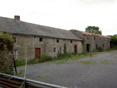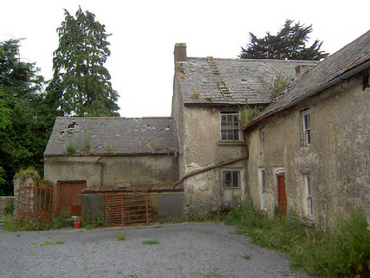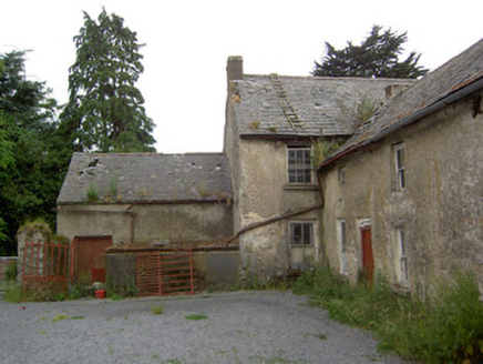 Detached four-bay two-storey house, dated 1648, having slightly lower two-bay two-storey block to rear. Altered c.1730, refenestrated, and provided with flanking single-bay single-storey with attic wings. Pitched slate roofs with ridge tiles, rendered end chimneystacks to main block, red brick to rear block, and cast-iron rainwater goods. Pebbledashed walls with carved limestone armorial plaque to front façade and having large blocky limestone quoins to north-east corner of main block. Square-headed window openings with timber-sliding box sash windows to main block, six-over-six pane to front and first floor of rear and two-over-two pane to ground floor, double four-over-four pane to front of wings, and three-over-six and two-over-two pane to rear block, most with cut limestone sills. Square-headed door opening, asymmetrically placed, with timber panelled door and overlight. Window shutters to interior. Yard of outbuildings to rear. West range comprising three-bay two-storey block with pitched slate roof and rubble limestone walls with square-headed window and door openings and with slightly higher six-bay two-storey block to north having barrel-profile corrugated-iron roof with segmental-arched entrances to ground floor. Shorter single-storey blocks to north side of yard with rendered walls and pitched corrugated-iron roof. East range comprises single-storey block with pitched slate roof, part rendered rubble limestone walls and segmental-arched carriage entrances. Walled garden to east of house and yard.
