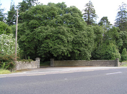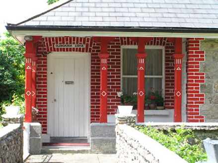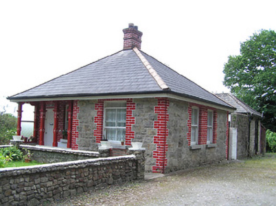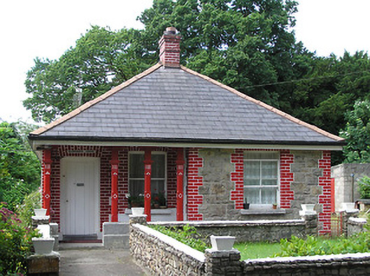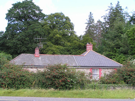 Detached three-bay single-storey former gate lodge, built c. 1880, now in use as house, having return to south end of rear elevation and entrance and middle bay recessed behind line of roof to front to form verandah completing the plan. Flat-roofed single-storey extension to rear and adjoining single-storey outbuilding and small yard to west, all forming an overall rectangular plan. Artificial slate roof, pyramidal to main block and hipped to return, with timber panelled eaves and having red brick chimneystacks. Roof overhanging verandah supported on decoratively carved chamfered timber square-profile posts on stepped cut limestone plinth wall. Snecked roughly dressed squared sandstone walls, having painted brick quoins to front elevation, with painted brick wall to inside of verandah. Square-headed openings with brick voussoirs and jambs. Two-over-two pane timber sliding sash windows with tooled limestone sills and timber battened door with limestone step. Yard to rear has rubble sandstone wall, timber battened gate and single-storey outbuilding with hipped artificial slate roof and lean-to corrugated-iron and timber extension to west. Garden to front with rubble sandstone boundary wall. Dressed snecked limestone walls with copings to main entrance, having dressed square-profile limestone piers having moulded string course, with stile.