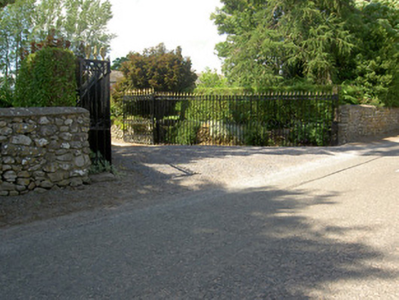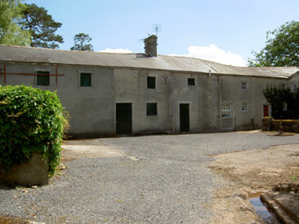 Detached L-plan three-bay two-storey house, built c. 1820, with slightly lower return and recent conservatory extension to south-east, and adjoining outbuildings to rear. Hipped slate roof with lead ridging, centrally-placed red brick chimneystacks, and cast-iron rainwater goods. Roughcast lime rendered walls. Square-headed window openings with replacement uPVC windows, having cut sandstone surrounds and limestone sills. Round-headed door opening with cut sandstone surround to timber panelled door with spoked timber fanlight. Multiple-bay two-storey outbuilding to rear with pitched slate roof, having cut sandstone bellcote with string course and elliptical-arched opening, cast-iron rainwater goods, having square-headed openings to north-west elevation with louvred and battened fittings and render surrounds, and having blocked segmental-arched former carriage entrance with sandstone voussoirs having prominent keystone. Quadrant entrance gateway with decorative cast-iron railings and double-leaf gates to front of site.