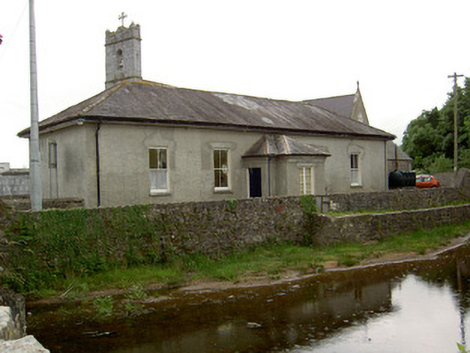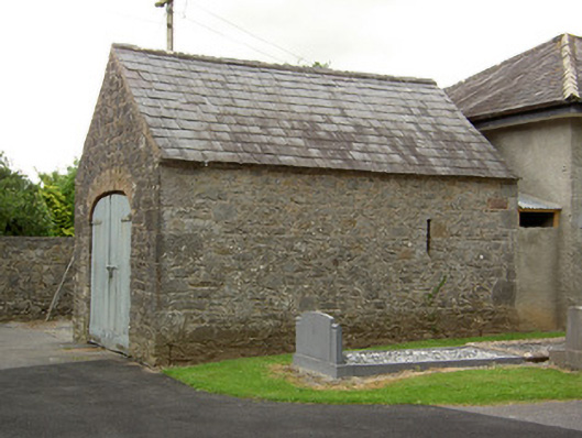 Detached five-bay single-storey former school, built c. 1840, with stepped-profile porch to front. Hipped slate roofs with cast-iron rainwater goods, and having lead flashing to porch. Roughcast rendered walls, with stepped eaves course to porch. Two-over-two pane timber sliding sash windows with limestone sills, bipartite horizontal-paned timber casement window to porch, rear elevation having round windows and square-headed double bipartite timber windows. Square-headed timber battened door to side walls of porch. Outbuilding to north-west with pitched slate roof, coursed rubble limestone walls and having segmental-arch opening with red brick voussoirs and timber battened double-leaf doors.