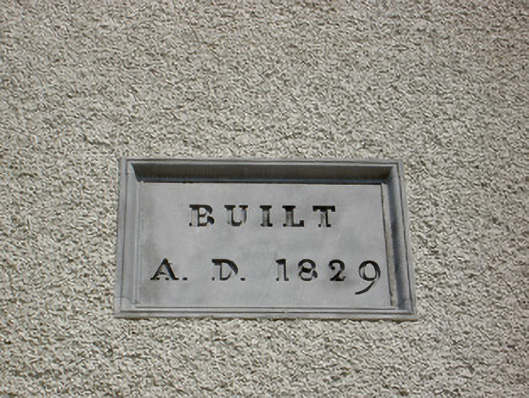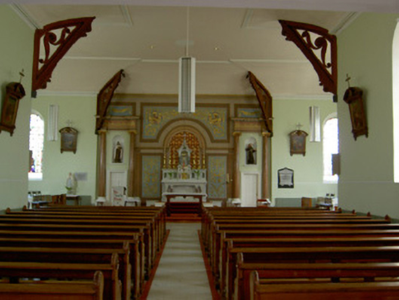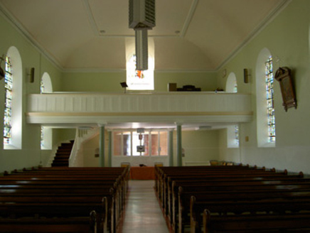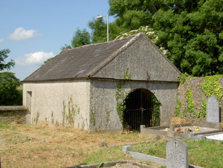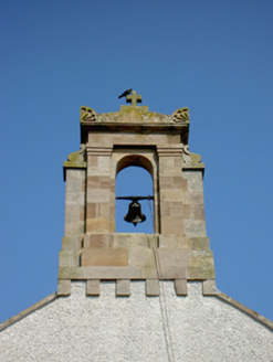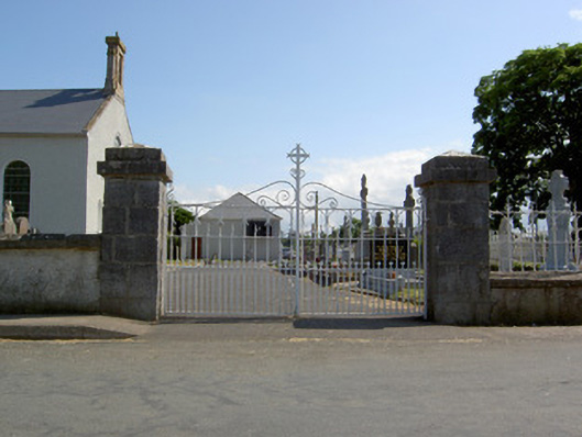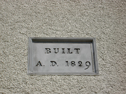 Freestanding T-plan gable-fronted church, built 1829, with three-bay nave and having two-storey vestry to east end. Hipped artificial slate roof, pitched to gable-front, with cut sandstone copings and bellcote to gable-front, and cast-iron rainwater goods. Pebbledashed walls with smooth rendered plinth and having carved limestone plaques, one a date plaque, and blind niches with cut limestone sills flanking main entrance doorway. Bellcote has stepped profile with cut stone acroteria to cornice, having cross finial, and pilasters flanking recessed round-headed bell opening, flanked by recessed stonework topped with scroll ornament. Round-headed window openings, that to gable-front having cut limestone surround and sill, that to sacristy being blind, those to nave having concrete sills, and all windows having stained glass. Round-headed door opening to gable-front with cut limestone surround and plinths to double-leaf replacement timber battened door with stuccowork to tympanum. Square-headed door openings to transepts with replacement timber battened doors. Ornate altar end to interior comprising sculpted marble reredos set into round-headed recess with moulded archivolt and impost course and flanked by Corinthian pilasters, all in turn flanked by Ionic engaged columns flanking square-headed timber panelled doorways to sacristy having round-headed statue niches above, with ornately painted panels to altar wall. Ornately carved timber brackets to each corner of crossing. Carved timber gallery supported om marble columns to main entrance end of nave. Outbuilding to north-east of church with pitched slate roof, roughcast rendered walls, with segmental-headed opening to gable having double-leaf cast-iron gates. Graveyard to site, with decorative wrought-iron vehicular gates set to dressed limestone piers with cut-stone caps to front boundary.