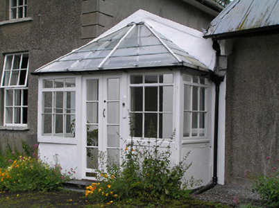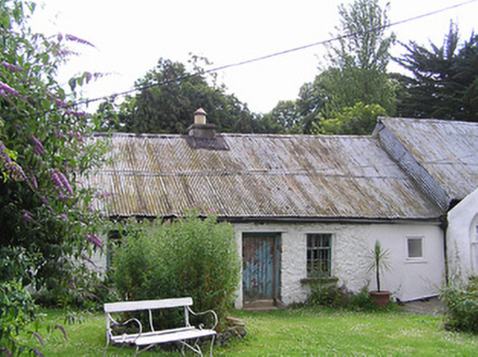 Detached three-bay two-storey house, built c. 1820, with single-bay single-storey gable-fronted link block with glazed projecting porch, connected to south end of multiple-bay single-storey lobby-entry vernacular house further east, and two single-storey extensions to rear of main house. Extensions to rear of main house have lean-to artificial slate and pitched corrugated-iron roofs. Hipped slate roof to main house, with overhanging eaves and rendered chimneystack. Pitched slate to middle addition with hipped glazed roof to porch and hipped corrugated-iron roof to vernacular house, pitched corrugated-iron and lean-to artificial slate roofs to rear extensions. Roughcast rendered walls to front and rear walls of main house and to vernacular house, smooth rendered to gable ends of main house, with render quoins to front of main house. Square-headed window openings with replacement timber windows and concrete sills, margined timber casement windows and French doors to south end of vernacular house, with decorative overlights. Timber sliding sash nine-over-six pane window to rear elevation of main house and four-pane fixed timber window with spoked fanlight and barred to rear of link block. Timber sliding sash three-over-six and six-over-six pane windows and timber battened door to front, west, elevation of vernacular house. Glazed fixed timber windows to porch with glazed timber double-leaf doors. Rubble stone boundary walls with square-profile rubble stone piers and cast-iron double-leaf gates with spearhead detail.