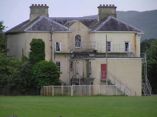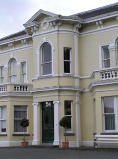 Detached U-plan three-bay two-storey over basement house, built c. 1770, subsequently remodelled c. 1880, having three-storey elevation to rear, projecting full-height bowed entrance bay with open-bed pediment, balustraded canted-bay windows to ground floor front, and recent flat-roofed two-storey extension and recent fire escape to rear. Entrance bay has full-height pilasters at junction with house proper, presenting to ground floor as Ionic pilasters with entasis. Hipped slate roofs, pitched to central recessed rear bay, with rendered chimneystacks. Decorative paired brackets to front and south elevations only, with moulded cornice above, continuing to form part of pediment to entrance bay, and moulded platband below. Painted lined-and-ruled rendered walls with render detailing to front and south elevations, comprising plinth with moulded coping, platband at cornice level of bay windows, moulded platband at first floor sill level, forming sills to windows of south elevation and continuing to form coping to balustrades of bay windows. Timber sliding sash one-over-one pane windows to front and south elevations, with rounded corners to glazing, and having moulded surrounds to south elevation and to first floor of front elevation, all with render keystones, ornately-detailed knees to front elevation and shoulders and knees to south elevation, and having cut limestone sills to all windows of front elevation. Venetian windows to first floor end bays of front elevation with render keystones and moulded imposts. South elevation has one tripartite window to first floor. Bay windows have double sash frames to front faces, with panel detail to mullions, moulded render string course above windows and having balustrades with slightly projecting moulded plinths. Rear elevation has six-over-six pane timber sliding sash windows, extension has some three-over-three pane timber sliding sash windows, and both have some uPVC replacement windows, all windows having cut limestone sills. Entrance bay has blind oculus to pediment with render surround, and round-headed window to first floor flanked by square-headed windows to curved sides, with sills set into sill course. Square-headed entrance doorway with glazed timber panelled vertically-divided door with overlight and flanked by render Ionic pilasters, matching those elsewhere to entrance bay, and similar windows to first floor. Square-headed door opening with render Ionic pilasters with half-glazed timber panelled vertically-divided door with overlight and limestone step. Doorways, one blind, to south elevation, with moulded render surrounds, one with keystone and glazed timber panelled double-leaf door with sidelights and overlight. Walled garden to north with rubble stone walls. Yard to north has ranges of two-storey outbuildings to west and north, having barrel-profile corrugated-iron roofs and rendered rubble stone walls. Seven-bay west range has round-headed doorways with render over cut sandstone voussoirs and remains of timber battened doors, segmental-headed windows with brick arches and remains of timber frames, and lunette over centre doorway with render over rubble sandstone voussoirs. North range has paired elliptical-headed carriage entrances to centre and round-headed doorways to ends, with cut sandstone voussoirs with raised keystones, and segmental-headed windows with brick voussoirs and timber sliding sash windows.