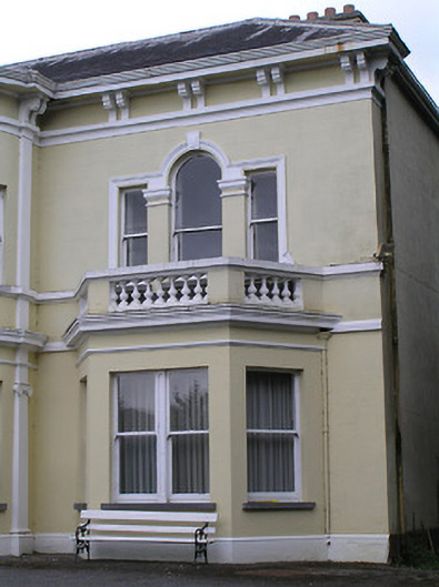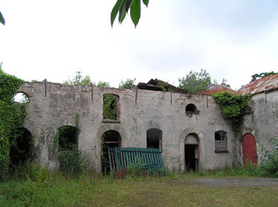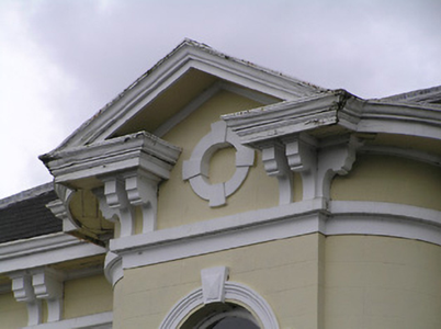 Although the fabric of this house dates from the late eighteenth century, its Italianate appearance is due to a Victorian remodelling. The decorative render treatment has been applied to the two main elevations of the building, the front and south elevation seen on approach, the platbands and elaborate bracketed cornice coming to an abrupt halt just around the corner of the rear elevation. The Venetian windows and Ionic pilasters are classically inspired, but this classicism is freely interpreted to create a new specifically nineteenth-century type of architecture. The projections on the front façade and the exploitation of the sculptural properties of render for exterior decoration are both typical of this period. The double-height porch incorporates bowed sash windows, a feat of carpentry and glazing, an indication of the skill of the craftsmen involved. The associated outbuildings are well designed and typical demesne buildings with sandstone voussoirs to the door openings.
