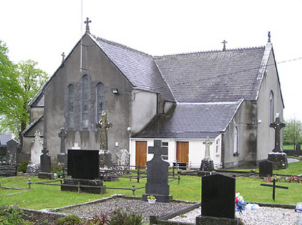 Detached cruciform-plan Roman Catholic church, built c.1835, having three-bay nave elevation, full-height chancel and transepts, entrance porch to north of nave, single-storey additions to east, and two-storey attached tower to south. Pitched slate roofs having cast-iron ridge crestings, limestone belfry and crosses. Snecked limestone and unpainted rendered walls with cut-stone quoins. Round-headed openings with stained-glass windows having chamfered limestone surrounds and replacement timber doors having limestone surrounds. Square-headed opening having timber battened door to north-east. Interior has chancel arch, round-plan columns supporting round-headed arcade to transepts, king post truss roof, and timber gallery to west. Graveyard to site. Decorative concrete paving to site. Rubble and rendered boundary walls, rendered piers and cast-iron gates to site.