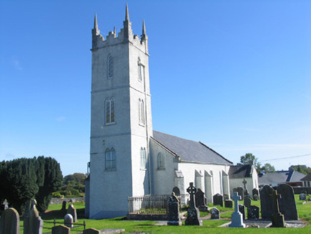 Freestanding Board of First Fruits Church of Ireland church, built 1812, having three-stage bell tower to west end, vestry to southeast corner and boiler house to northeast corner. Pitched artificial slate roof with moulded limestone coping to gables and cut-stone chimneystacks to vestry and boiler house with decorative corbel to bases. Pebble-dashed walls with smooth render plinth. Cut limestone crenellations, pinnacles and string courses to tower, and rendered buttresses to side walls with cut limestone caps. Lancet and double-light lancet windows with traceried small-pane timber sliding sash windows, fixed to tower and vestry and fifteen-over-fifteen pane to nave, with limestone sills and with louvered windows to upper stages of tower. Timber battened doors, that to vestry having cut limestone surround. Cut limestone gate piers, cast-iron gates and graveyard to site.