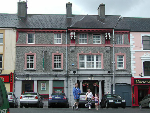 Terraced four-bay three-storey purpose-built bank, built c.1880, with integral carriage arch and having two-storey breakfront, with open internal porch comprising Ionic columns and frieze. Pitched artificial slate roof with rendered chimneystacks. Roughcast rendered walls with moulded sill course, cornice, modillions and paired decorated consoles to upper floors. Smooth rendered walls to ground floor with rusticated piers to entrance having render mask and floral decorations and render cornice and frieze. Timber sliding sash windows, with tripartite window to first floor of entrance bay, and having three-over-three pane windows to second floor, six-over-six to first floor, with render surrounds and having keystone decorations to first floor. Plate glass and replacement timber windows to ground floor. Segmental-headed carriage arch with timber battened double-leaf door.