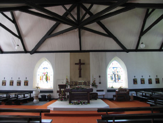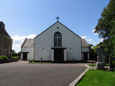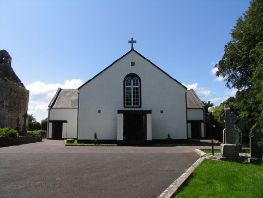 Freestanding T-plan Catholic church, built 1813, having later entrance porch to east end and sacristy to west end. Single-bay side elevations to nave and single bay transepts. Pitched slate roofs having concrete coping and with rendered chimneystack to sacristy. Pebble-dashed walls with three carved stone heads to east elevation. Round-headed windows with pointed timber double lights with concrete surrounds and sills, and with large pointed windows to each side of altar. Replacement timber battened doors. Exposed timber roof trusses to interior with timber tongue-and-groove ceiling above with moulded timber cornice. Stained-glass windows, one to each side of altar, with figures of Saints Ruadhán and Patrick, added 1909.