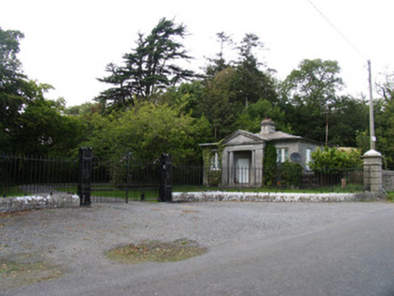 Detached three-bay single-storey gate lodge to Modreeny, built c.1850, having pedimented entrance portico. Hipped slate roof with cut-stone chimneystack. Dressed limestone walls with ashlar limestone portico in antis. Timber margined mullioned casement windows with replacement uPVC windows to west elevation. Timber panelled doors. Quadrant gateway with ornamental cast-iron gates flanked by railings on cut-stone plinth.