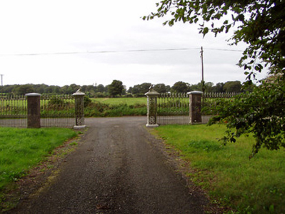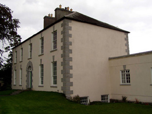 Detached five-bay two-storey house over basement, built c.1820, with return and modern extension to rear and modern flat-roofeextension to south. Hipped slate roof with rendered chimneystacks. Lined-and-ruled rendered walls having raised render quoins. Roughly-dressed limestone walls in rear elevation with brick surrounds to openings. Timber sliding sash windows, twelve-over-eight pane to ground floor, eight-over-eight to first, ten-over-ten to basement and mainly eight-over-eight to rear, set in square-headed openings with raised render keystones and limestone sills. Timber panelled door in round-headed opening having cobweb fanlight, flanked by fluted octagonal pilasters, and having raised render block-and-start surround. Flight of ashlar limestone steps leading to entrance. Decorative cast-iron gate piers, with wrought-iron railings and cut-stone flanking piers, and roofless three-bay single-storey limestone rubble gate lodge to road.
