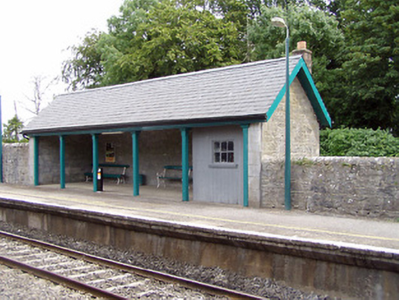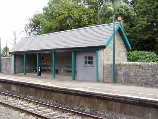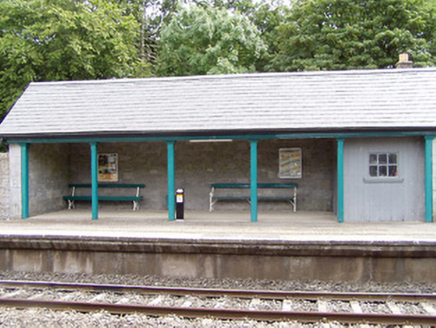 Detached multiple-bay single-storey waiting room, built c.1848, open-sided to track-side elevation and with former office to south end of interior. Pitched slate roof having brick chimneystack. Coursed snecked rubble limestone walls, with cut limestone quoins and with chamfered square-plan timber posts to front. Timber planking to former office, having square-headed opening with fixed timber window and timber sill. Cast-iron and timber seats to interior. Building flanked by coursed rubble walls bounding platform.