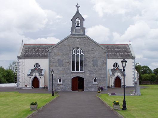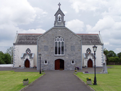 Freestanding cruciform-plan gable-fronted Catholic church, built 1830, with two-bay nave, single-bay transepts having projecting entrance porches and with recent sacristy to west. Pitched slate roofs with ridge cresting, cut limestone cross finials and with cut limestone bellcote to east gable. Roughcast rendered walls with rendered quoins. Exposed roughly-dressed limestone walling to east gable with limestone plaques. Pointed-arch traceried window openings to nave and transepts, lancets to side walls of altar end, with limestone sills and stained-glass windows. Four-centred-arch window to gable-front with limestone voussoirs. Four-centred-arch main door opening with limestone voussoirs and jambs. Timber battened double-leaf door to all entrances, flanked by small pointed-arch windows to main entrance and with raised cut limestone surrounds to lean-to transept porches. Highly ornate reredos comprising central columns and pilasters supporting entablature with decorative devices above, flanked by decorative plaster detailing to altar wall and approached by steps to marble altar. Coffered timber ceiling with decorative rose to crossing. Lawns around church and rubble limestone boundary walls and gate piers with cast-iron gates to road frontage. Parish hall to south side of grounds.