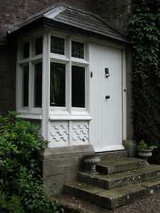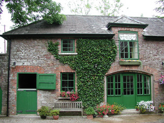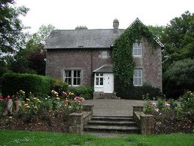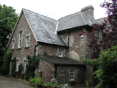 Detached single-storey glebe house with dormer floor, built c.1880. Now in use as private house. Comprises three-bay single and two-storey front block with advanced gabled end bay, shorter two-storey middle block with gable-fronted projecting block at right angles. Hipped porch built into angle of front elevation. Pitched and hipped slate roofs with brick eaves course and decorative timber bargeboards. Snecked broken-coursed dressed sandstone to front elevation and exposed rubble sandstone to rear, with dressed limestone quoins. Square-headed openings with cut limestone block-and-start surrounds, two-over-two pane timber sliding sash windows and limestone sills. Timber-framed entry porch on cut limestone plinth with scalloped shingle cladding, mullioned timber windows and limestone steps. Stone gate piers to courtyard with plinths and capstones, and stone entrance gate piers with cast-iron gates. Detached four-bay two-storey stable block, now part-house, part-stable, to rear of house, with integral segmental brick arch. Hipped slate roof. Rubble limestone walls with brick jambs and arches to some windows and doors. Replacement timber windows and timber and glazed door with paned over-light. Carriage arch now glazed.