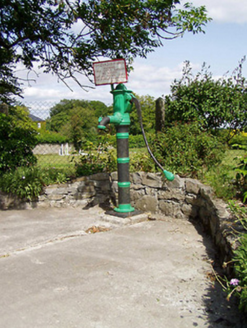Cast-iron water pump, c.1870, with banded cylindrical shaft, fluted neck, fluted spout with ram's head bucket grip, fluted cap with pointed finial and cow's tail pumping handle. Set in rubble limestone walled enclosure.