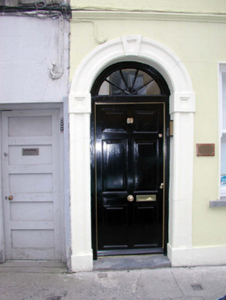 Terraced two-bay four-storey house, c.1840. Extensively renovated, c.1990, to accommodate use as offices. One of a pair. Pitched slate roof with clay ridge tiles, rendered chimney stack, and replacement uPVC rainwater goods, c.1990, on moulded rendered eaves. Painted rendered, ruled and lined walls with moulded rendered stringcourse to first floor. Square-headed window openings with cut-stone sills. Replacement 3/6 and 6/6 timber sash windows, c.1990, with replacement 1/1 timber sash windows, c.1990, to ground floor. Round-headed door opening with moulded rendered surround having keystone, and replacement timber panelled door, c.1990, with spoked fanlight. Road fronted with concrete footpath to front.